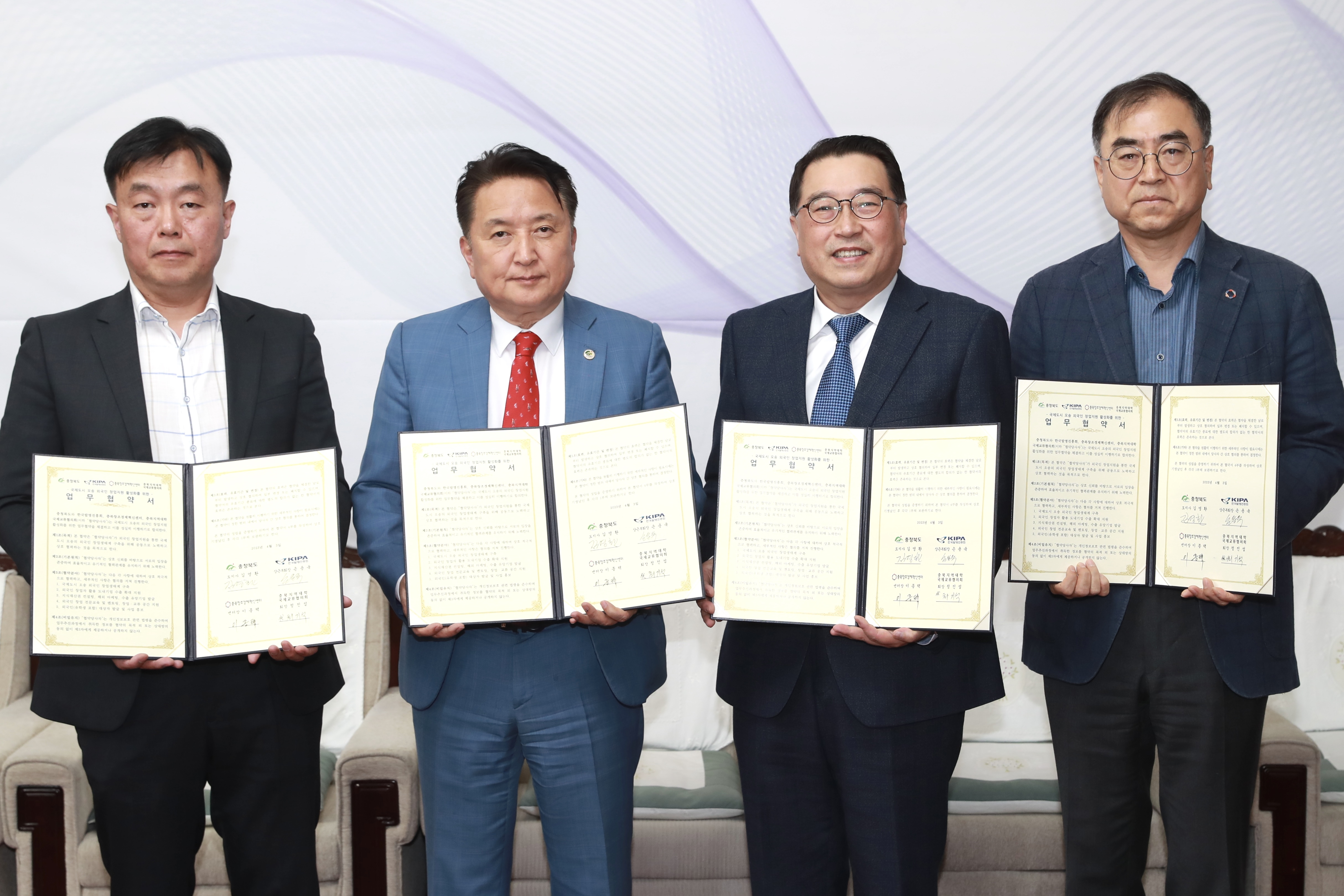 김영환 충청북도지사 4월 3일 오후 2시 충북도청에서 한국발명진흥회, 충북창조경제혁신센터, 충북지역대학국제교류협의회와 ‘외국인 창업지원을 위한 업무협약’을 체결했다.