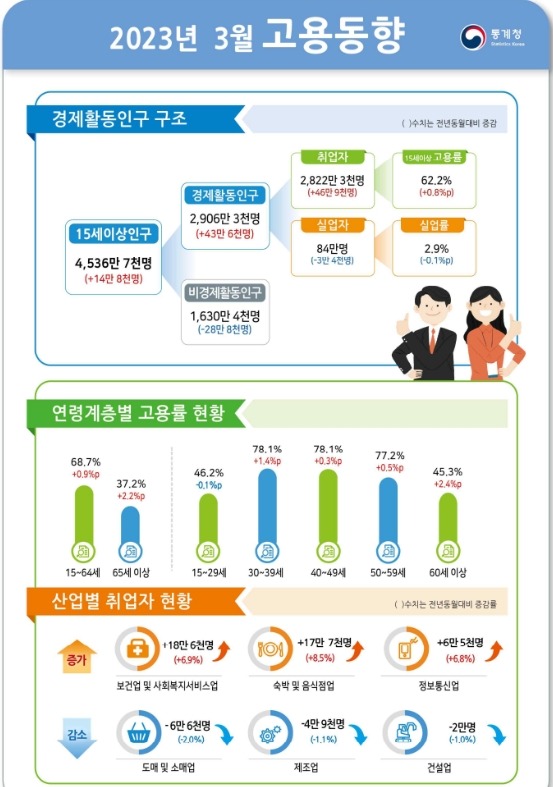 실업자 수는 84만명으로 3만 4000명 줄었고 실업률은 2.9%로 0.1%포인트 내렸다. 실업률은 1999년 6월 통계 개편 이후 3월 기준 최저치다.