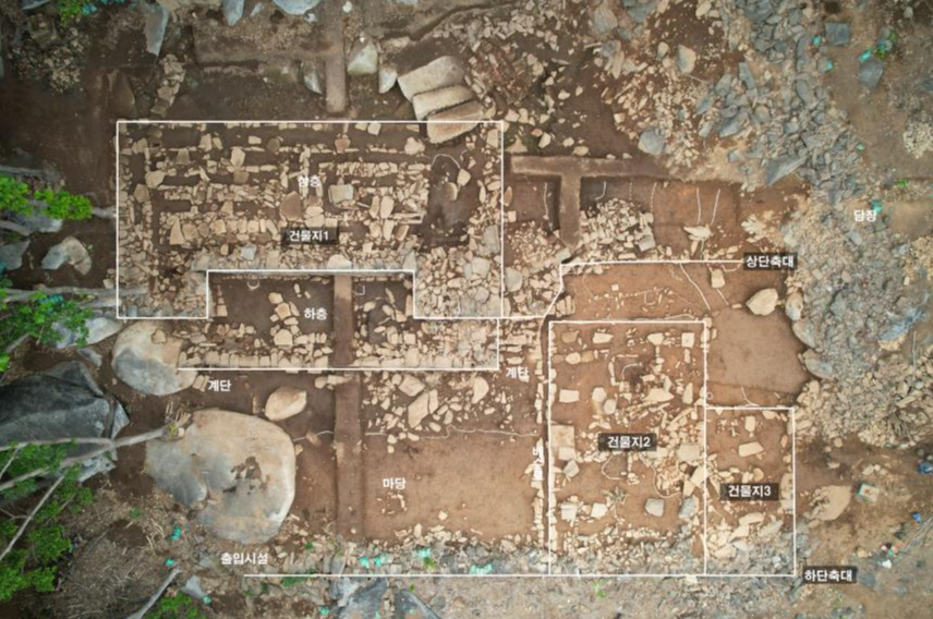 건물지는 모두 3동이 확인되었는데, 대규모의 중심 건물과 생활시설을 갖춘 부속 건물로 구분되어 있다. 상단 평탄지에 위치한 북쪽의 중심 건물은 경사 지형을 이용한 다락집 형태의 건물지로, 상층에는 대규모의 난방시설을 갖춘 방과 누마루가 설치되었다. 건물의 난방시설은 방 양쪽에 설치된 아궁이를 통해 유입된 화기가 방 전체를 ‘ㄷ’ 형태로 회전하면서 건물 북쪽으로 각각 빠져나가는 구조로, 13세기 전면온돌(방 전체에 깔린 온돌)의 온전한 형태를 갖춘 귀중한 자료로서 주목된다. 이 온돌방에 잇대어 누마루가 설치되었고, 누마루의 하부는 별도의 건물 공간으로 활용된 것도 확인하였다. 이와 같은 다락집 구조는 지금까지 동 시기 유적에서 확인된 사례가 없는 것으로, 고려시대 건물 구조를 새롭게 이해할 수 있는 중요한 근거가 된다.
