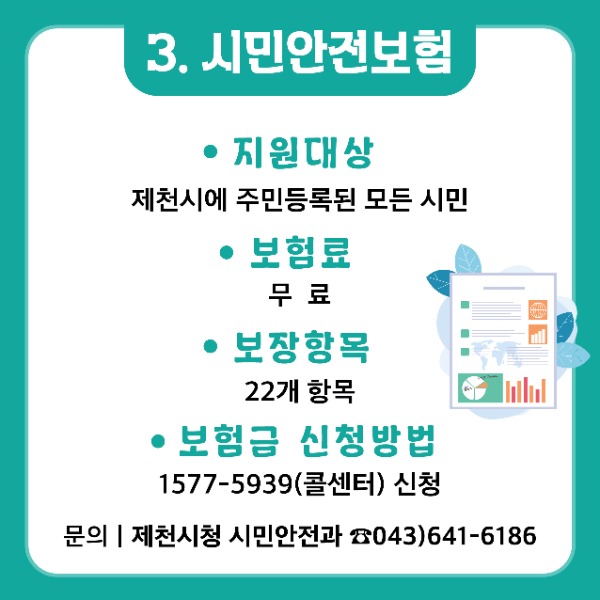 시민안전보험은 제천시에 주민등록을 둔 모든 시민은 별도의 가입 절차 없이 자동으로 가입되며, 전국 어디에서 발생한 사고라도 보장을 받을 수 있고 타 보험과 중복 보상도 가능하다.