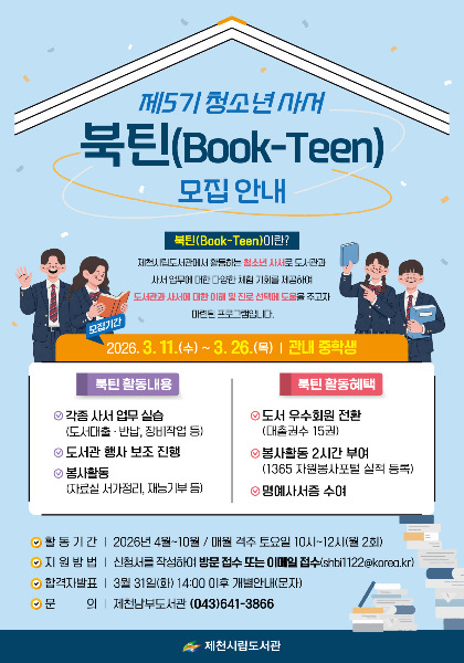 제천시립도서관은 2026년 제5기 청소년 사서 ‘북틴(book-teen)’을 모집한다고 7일 밝혔다.