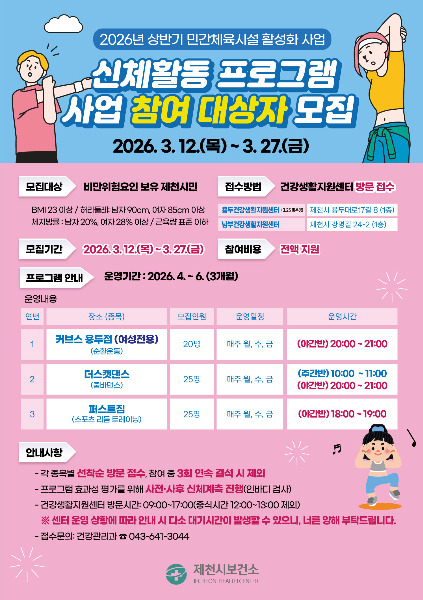 기타 자세한 사항은 제천시보건소 건강관리과(043-641-3044)로 문의하면 된다.