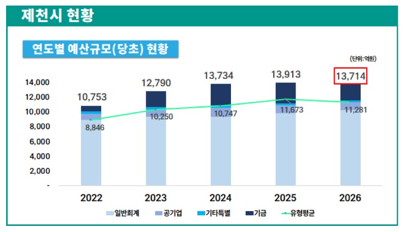 가장 눈에 띄는 대목은 전체 예산 대비 주민참여예산의 미미한 비중이다. 2026년 제천시 당초 예산은 1조 3,714억 원으로 , 주민참여위원회에서 선정된 예산은 고작 2억 6,800만 원(15건)에 불과했다. (5년 평균 반영 채택율 약20%)