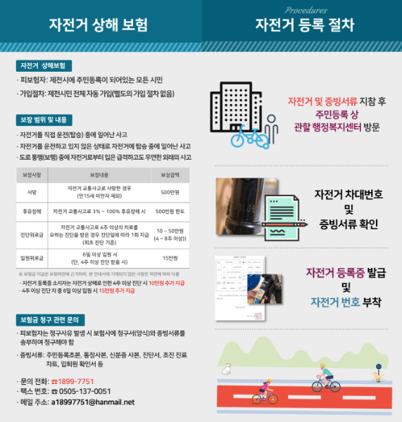 시 관계자는 “시민 자전거 보험은 사고로 인한 경제적 부담을 덜어주는 최소한의 안전장치”라며 “자전거 등록을 통해 도난 예방과 함께 추가 혜택도 받으시길 바란다”고 말했다.