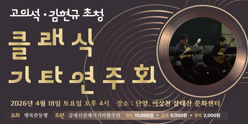 단양군 어상천 지역에서 활동하는 삼태산 클래식기타 합주단(회장 박운성)이 공연기획단체 행복한 동행(대표 홍원의)과 함께 오는 18일 오후 4시 어상천 삼태산문화센터에서 ‘고의석·김현규 초청 클래식기타 연주회’를 개최한다.