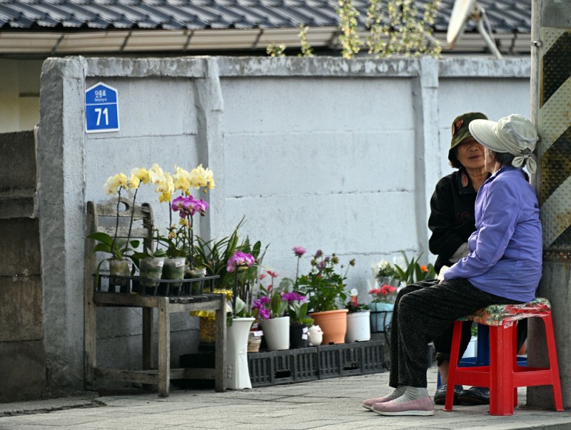 골목 한켠, 작은 의자 위에 앉은 두 사람이 이야기를 나눈다.