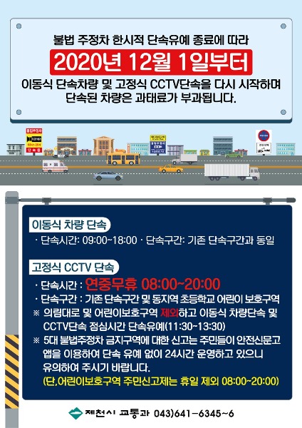 한편, 의림대로(제천역~비둘기아파트) 및 어린이보호구역을 제외하고 이동식 차량단속 및 CCTV 단속은 점심시간 11시 30분부터 13시 30분까지 단속유예를 실시한다.
