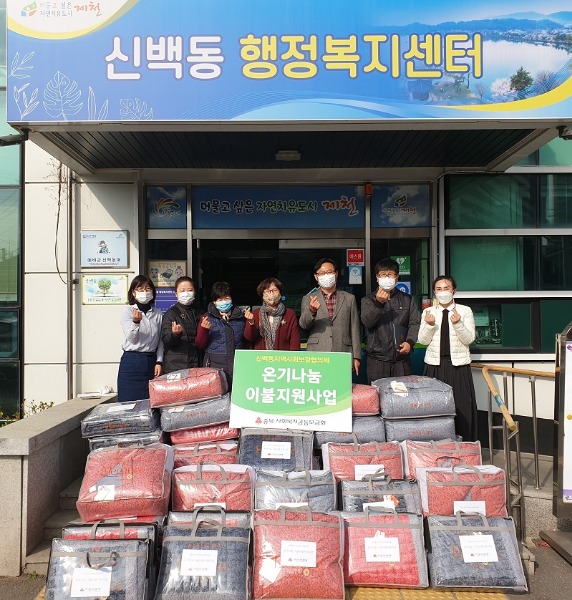 신백동 지역사회보장협의체는 활발한 활동을 통해 따뜻한 지역사회 분위기 조성에 노력하고 있으며, 특히, 올해 하반기 특화사업으로 생활이 어려운 독거노인 20여 가구의 따뜻한 겨울을 위해 “온기 나눔 겨울이불 지원사업”을 추진하고 있다.