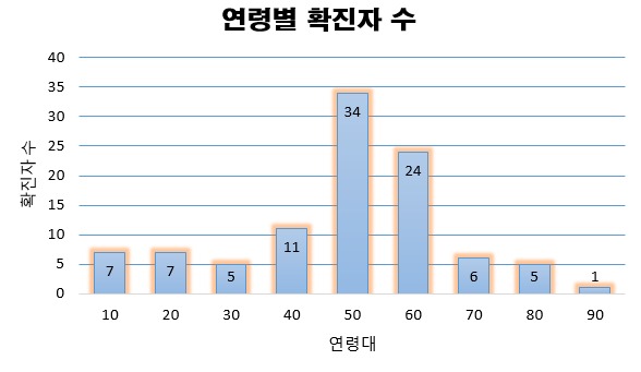 확진자는 10대 7명, 20대 7명, 30대 5명, 40대 11명, 50대 34명, 60대 24명,70대 6명, 80대 5명 90대 1명이다.