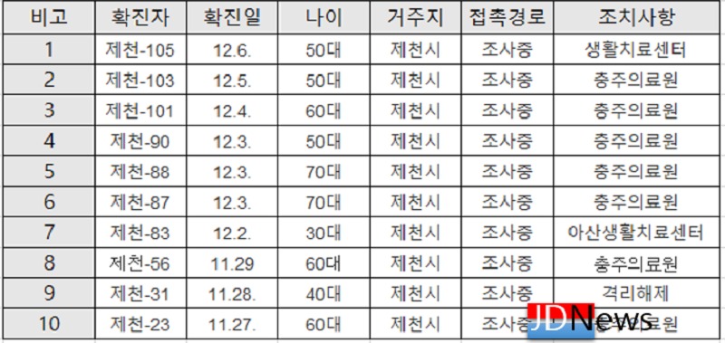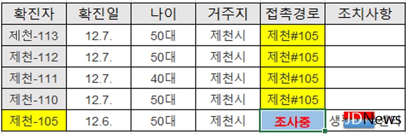 (제천=JD News) 이용희 기자 = 제천지역에서 신종 코로나바이러스 감염증(코로나19) 확진자가 계속 속출하고 있는데, 확진자중 10명이 넘게 감염경로가 파악되지 않아 방역당국이 초비상이다.