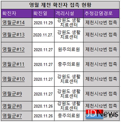 11월 26일, 27일, 29일, 3일동안 제천시 12번과 8명이 접촉하여 모두 코로나19 양성 판정을 받았다.