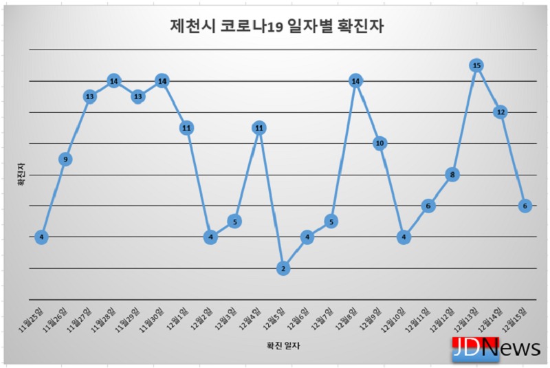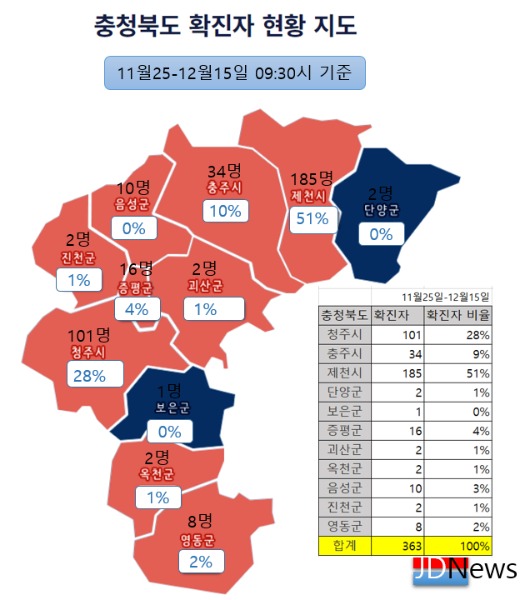 제천은 11월25일 부터 12월 15일 까지 코로나19 확진자가 185명 발생하며 충청북도내 확진자가 51% 압도적으로 많은 확진율을 보이고 있다.