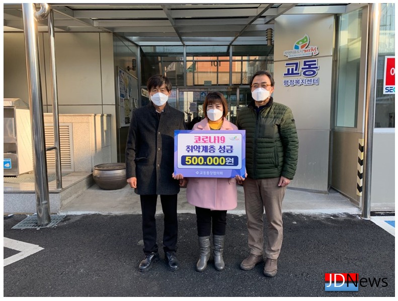 JD News 이용희 기자 = 제천시 교동행정복지센터(동장 이강주)는 12월 21일 (월) 교동 통장협의회에서 코로나19 취약계층 성금 오십만원을 기탁했다고 밝혔다.