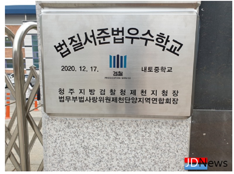JD News 이용희 기자 = 내토중학교는 청주지방검찰청제천지청(지청장 나욱진)과 법무부법사랑위원 제천·단양지역연합회(회장 오만식)에서 공동으로 주관한「2020년도 법질서 준법 우수학교」에 선정되어 증서와 인증패, 상금을 수상하였다.