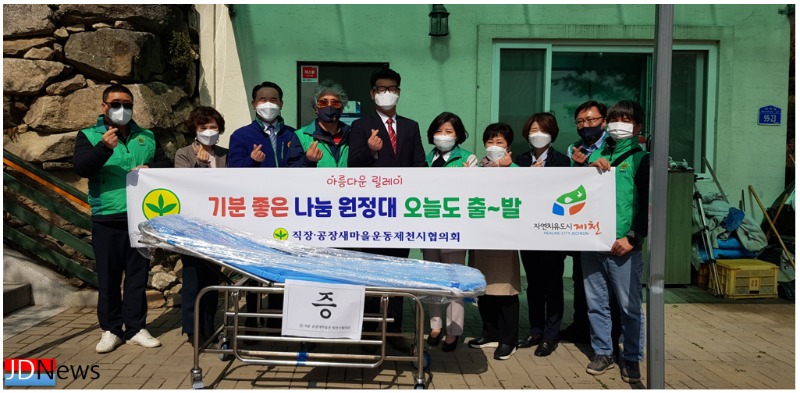 JD News 이용희 기자 = 직장공장새마을운동제천시협의회(회장 박경배)는 17일 제천시 봉양읍 소재 마인하우스 노인요양원을 찾아 평화나눔운동의 일환인 릴레이 사랑 나눔 행사를 실시했다.