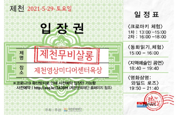 JD News 유소진 기자 = 제천문화재단(이사장 김연호)에 따르면 오는 29일 '2021년 문화가 있는 날' 지역특화프로그램으로 지역예술인과 함께하는 ‘제천무비살롱’을 개최 한다고 25일 밝혔다.