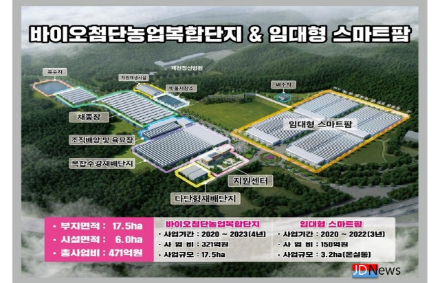 JD News 유소진 기자 = 제천시가 천남동 일원에 조성중인 바이오첨단농업복합단지에 입주해 미래 첨단농업을 이끌어갈 3개 선도기업과 충청북도 간 비대면 업무협약을 체결했다.