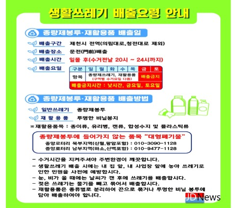 JD News 유소진 기자 = 12일 제천시는 생활쓰레기 배출사항 미준수로 도시경관을 해치는 경우가 늘어남에 따라 깨끗한 도시환경 조성을 위한 홍보에 나섰다고 밝혔다.