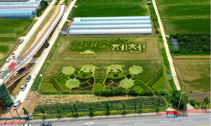 JD News 유소진 기자 = 제천시는 의림지와 도심을 잇는 에코브릿지(전망대형 육교)아래 오색벼로 수놓은 아름다운 논그림을 선보였다.