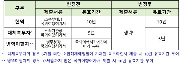 외교부는 지난 1월 개정 여권법 시행을 통해 병역미필자에 대한 단수여권 발급제도를 폐지하고 일괄 5년 유효기간의 여권발급을 개시했다.